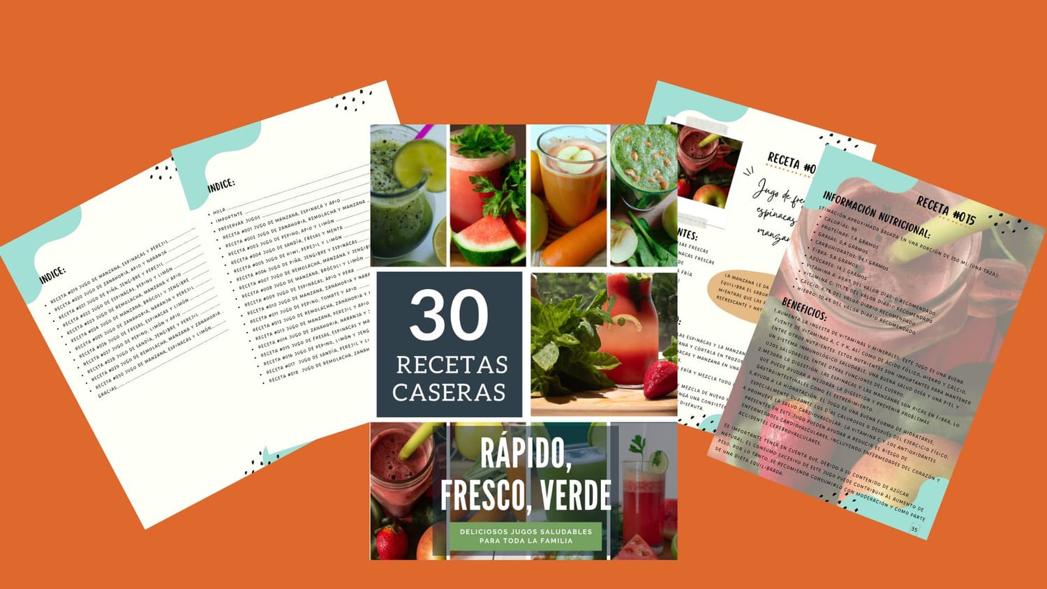 Cada receta fue diseñada con un criterio claro: que sea rápida de hacer, fácil de conseguir y poderosa por dentro. No es una lista de jugos cualquiera, es una guía estructurada con índice, ingredientes detallados, modo de preparación paso a paso y el valor nutricional de cada vaso.